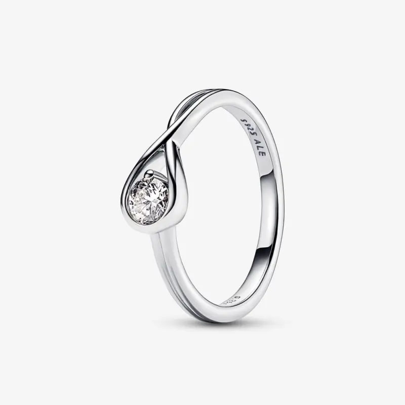 Um anel sólido de prata esterlina com um diamante cultivado em laboratório de 0,25 quilates montado manualmente. Uma bela declaração de empoderamento e possibilidade, ou uma simples mas eloquente declaração de amor. Este anel apresenta um cintilante diamante cultivado em laboratório redondo brilhante com corte excelente em uma montagem infinita moderna que flui perfeitamente ao redor da pedra. Pode ser usado sozinho ou combinado com outros anéis da coleção Pandora Infinite. Cada diamante cultivado em laboratório da Pandora é tratado com um realce de cor pós-crescimento chamado recozimento.