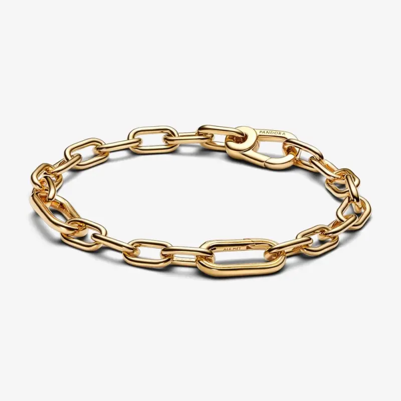 Conecte o que você ama como nunca antes. Nosso Bracelete de Corrente com Elos Pequenos Pandora ME banhado a ouro 14k oferece infinitas possibilidades de estilo. O design apresenta dois elos abríveis - elaborados com superfícies estriadas para diferenciá-los - um grupo de quatro elos entre cada elo abrível e um fecho de mosquetão. Primeiro, personalize sua corrente: quatro elos podem ser trocados por um elo duplo abrível ou um elo abrível - mantenha o comprimento original ou ajuste-o para lhe servir. Depois de criar sua corrente, estilize até dois medalhões significativos ou até oito mini charms pendentes em cada elo abrível para mostrar ao mundo quem você é. Observação: charms medalhão com tops abríveis podem ser usados em elos de estilo fechados.