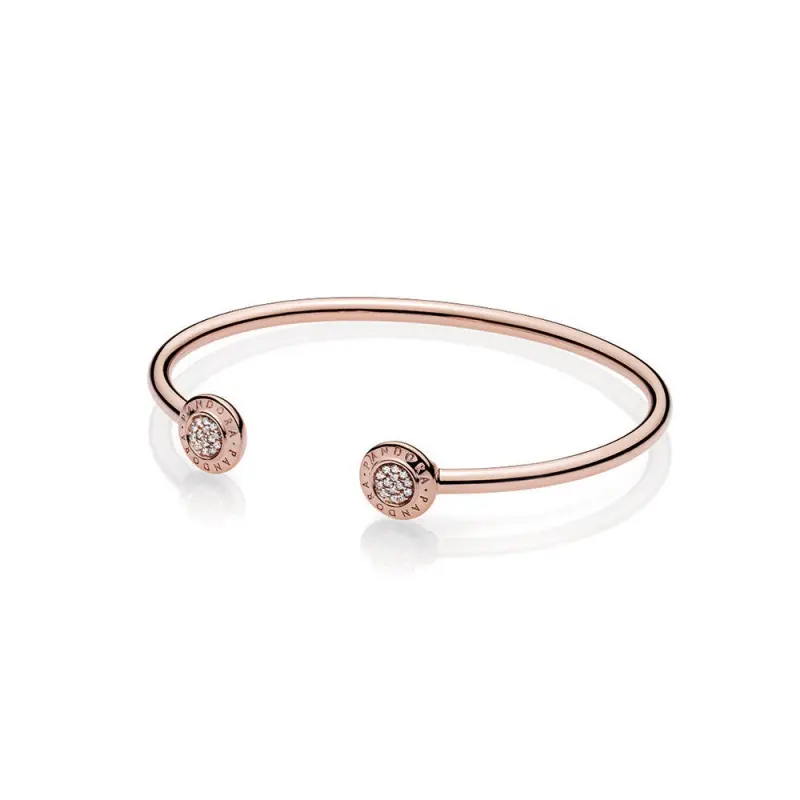 Renove seu estilo com joias indispensáveis como esta versão em PANDORA Rose™ do famoso bracelete rígido aberto. Suas belas decorações pavê e o visual minimalista dão um toque contemporâneo à elegância clássica. Bracelete rígido aberto com logotipo em PANDORA Rose com 28 zircônias cúbicas transparentes com cravação pavê.