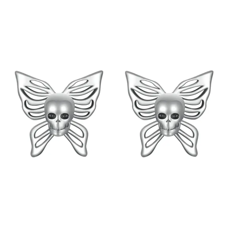 Os brincos de caveira e borboleta simbolizam a oposição e fusão da vida e da morte, mostrando um charme único.