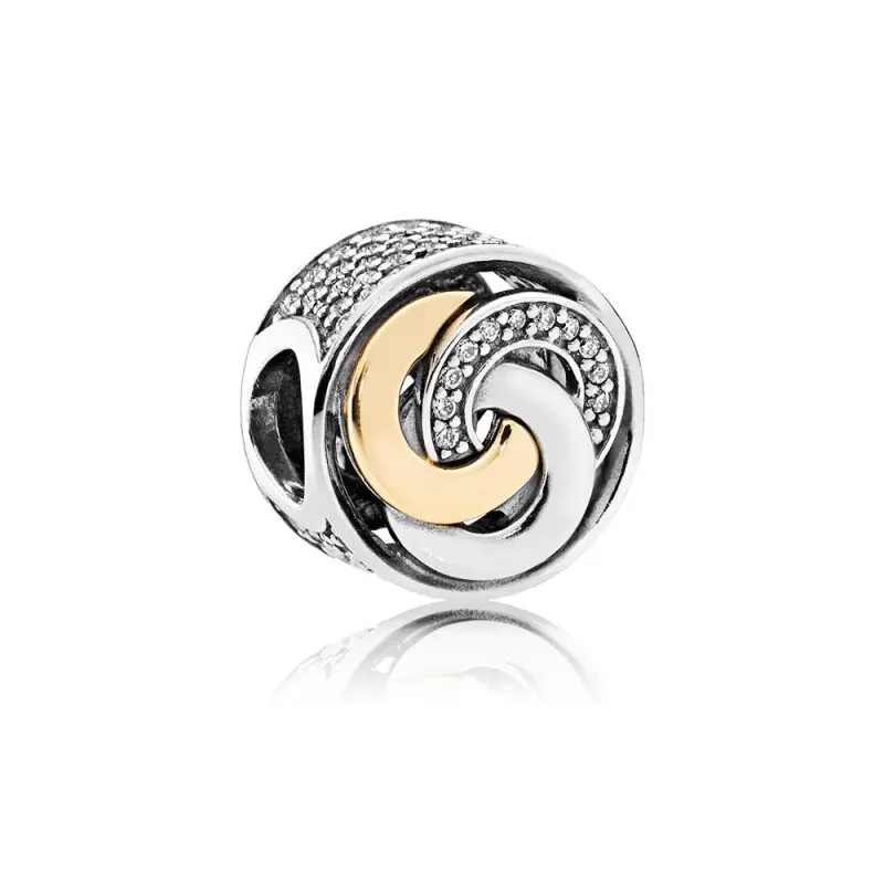 Um delicado motivo de três círculos entrelaçados decora este charm de botão em dois tons. É uma linda expressão de união e um símbolo atemporal do passado, presente e futuro. Charm prata com detalhes em ouro 14k, 22 microzircônias cúbicas transparentes com cravação em contas e 82 zircônias cúbicas transparentes com cravação pavê.
