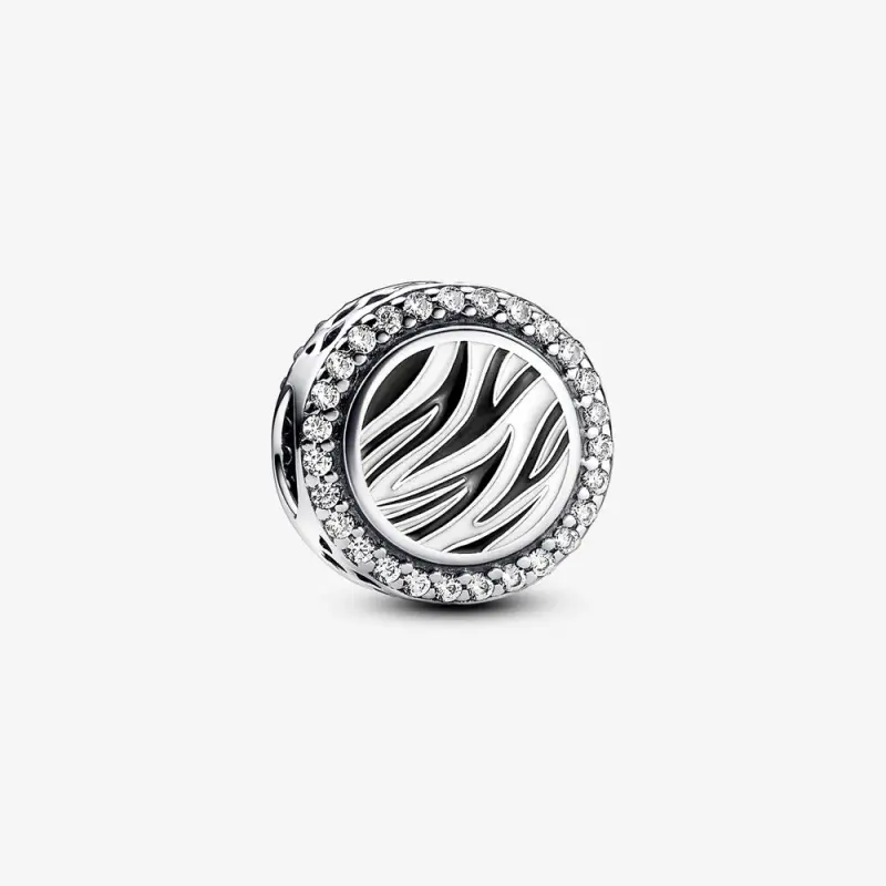 Charm redondo com estampa animal Características: O charm é decorado com padrão de zebra na frente e no verso; zircônia cúbica sintética pavé ao longo da borda; padrão de diamante vazado na lateral. Inspiração: A estampa de zebra representa os belos padrões derivados da natureza e da vida selvagem de animais e plantas; a zebra é um animal encantador comum na vida selvagem e na selva.