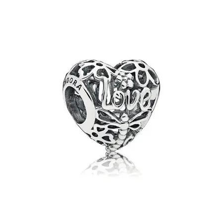 Mostre sua natureza positiva com este requintado charm de coração vazado em prata de lei. Flores e libélulas misturam-se às palavras gravadas "Love" (Amor) e "Life" (Vida). Charm em formato de coração em prata de lei com as gravações "Love" (Amor) e "Life" (Vida).