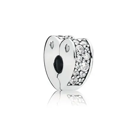 Mostre seu lado romântico em seu bracelete com este clipe em prata de lei. Ele possui um suporte de silicone que o mantém no lugar ideal nos braceletes, enquanto adiciona um brilho elegante. Clipe de coração em prata de lei com 28 zircônias cúbicas transparentes com cravação em contas e suporte de silicone.