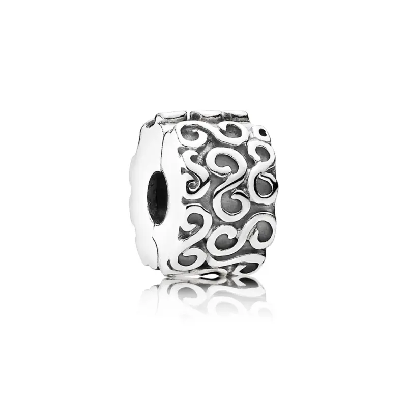 Clipe de Prata de Lei com detalhes do símbolo do infinito. Os Clipes são fixados em um dos nós e dividem os Charms de maneira uniforme no seu Bracelete PANDORA.