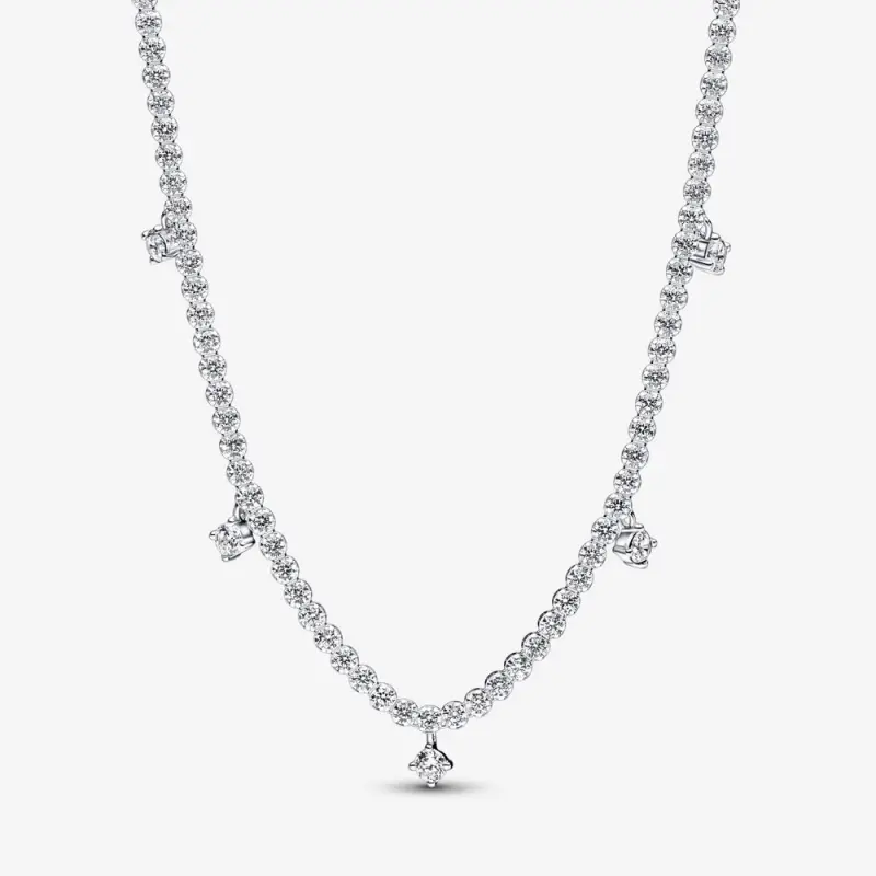 Sofisticado e elegante, este delicado Colar Gargantilha com Pingente Brilhante faz uma declaração clássica com pedras cintilantes que nunca saem de moda. Confeccionado em prata esterlina, o colar apresenta zircônia cúbica transparente e brilhante e é ajustável a três comprimentos. Com uma fileira contínua de pavé e pedras únicas maiores penduradas em intervalos ao longo do colar, esta peça é uma releitura moderna das silhuetas clássicas de bracelete de tênis.