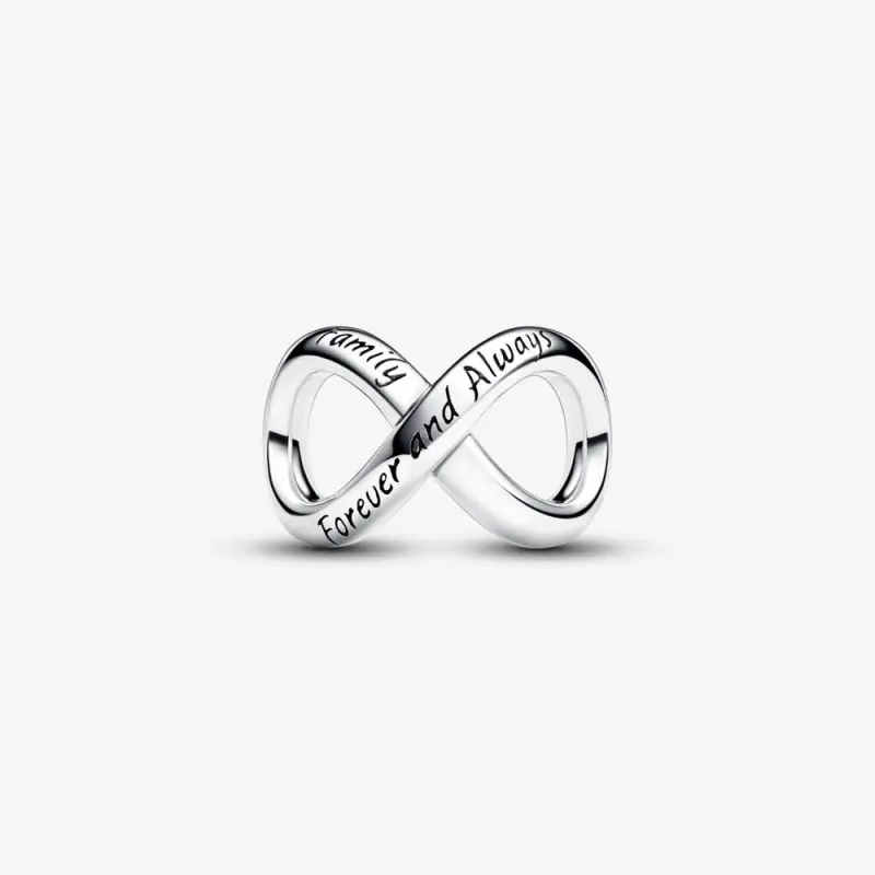 Mantenha os laços eternos por perto com nosso Charm do Infinito Forever & Always, uma peça única trabalhada em prata sterling. Abraçando a essência da família, o charm forma graciosamente o símbolo do infinito, ecoando a natureza atemporal dessas conexões preciosas. Gravado com as palavras sinceras 'Família' e 'Para Sempre e Sempre', este charm do infinito da Pandora captura o espírito duradouro da parentesco. Que ele seja um lembrete de que a família é para sempre, e a alegria encontrada em sua companhia é infinita.