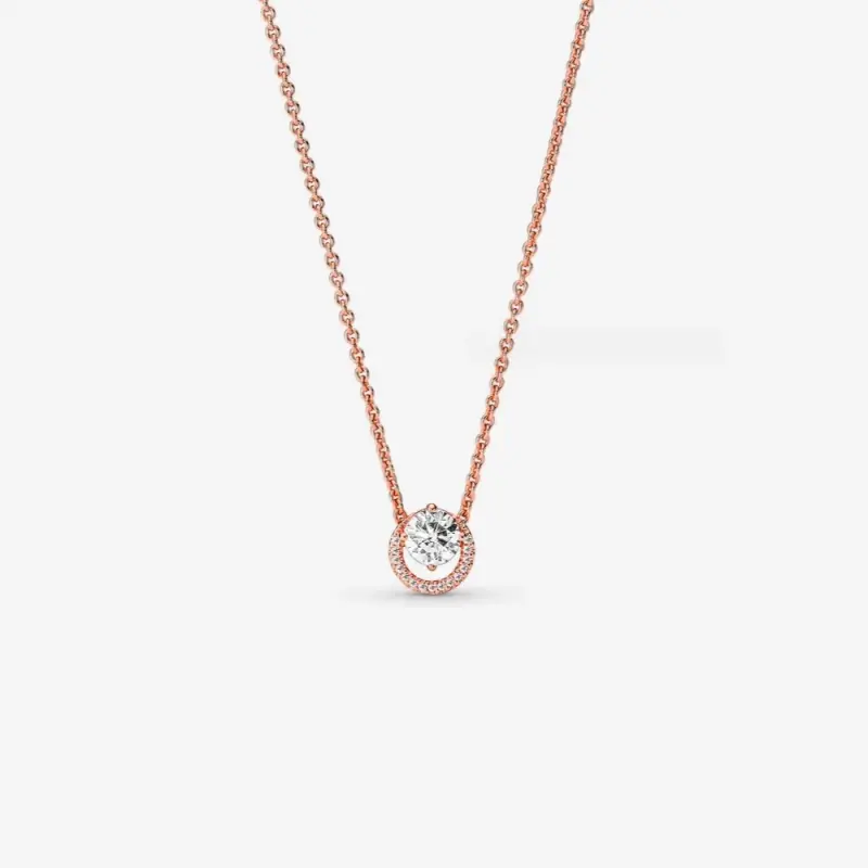 O clássico encontra o contemporâneo no colar Pandora Sparkling Round Halo Pendant Collier em ouro rosa. A tradicional montagem halo foi atualizada com uma configuração de pedra descentralizada para criar uma silhueta única. O comprimento da corrente é ajustável, tornando este um toque final versátil para sua roupa.
