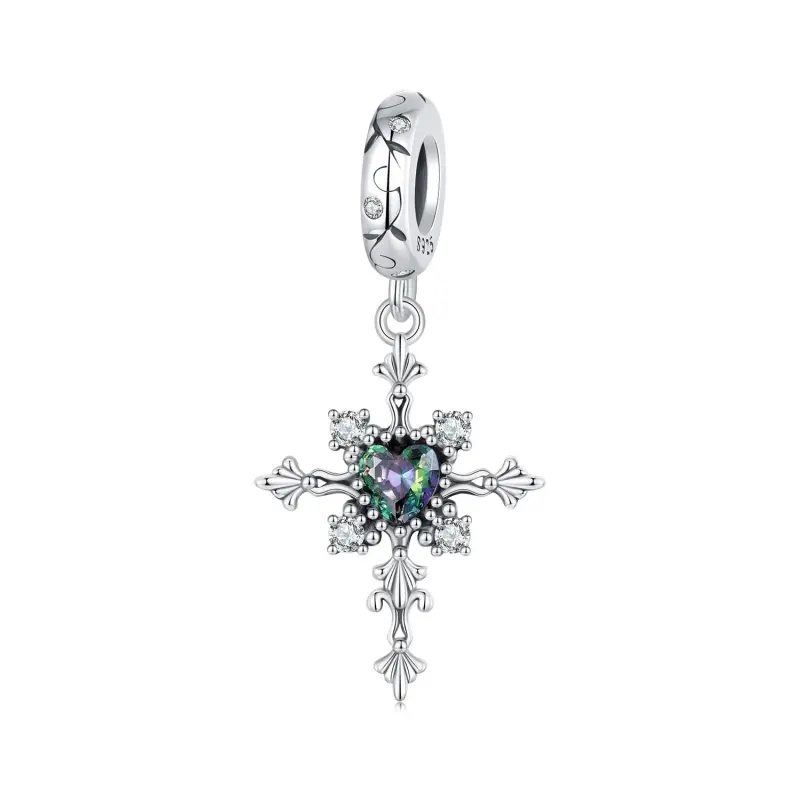 Apresentamos nosso requintado Pingente Cruz Estilo PANDORA! Este charm cruz com inspiração vintage apresenta intrincados padrões florais e um hipnotizante design de vidro em forma de coração preto iridescente. Simbolizando felicidade, sorte e proteção, este charm é perfeito para expressar amor e guardar seus entes queridos. Adicione um toque de elegância e simbolismo significativo à sua coleção de joias com este belo Pingente Cruz Estilo PANDORA.
